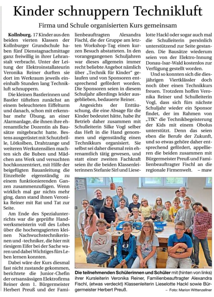 Immer donnerstags treffen sich zur Zeit einige Kinder unserer beiden vierten Klassen mit Frau Veronika Reiner vom gleichnamigen Elektrobetrieb Reiner in Kollnburg.